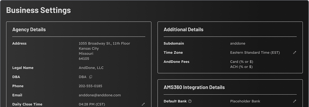 Personalize every part of your payment experience inside the AndDone Portal.
